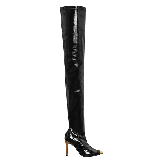 Black elastic vegan leather thigh-high stiletto boots, featuring shiny finish, pointed toe, thigh-high, gold metallic...