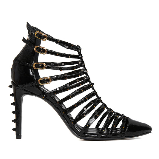 Pointed-toe booties crafted from natural patent leather, featuring adjustable straps with golden metal crystal adorned...