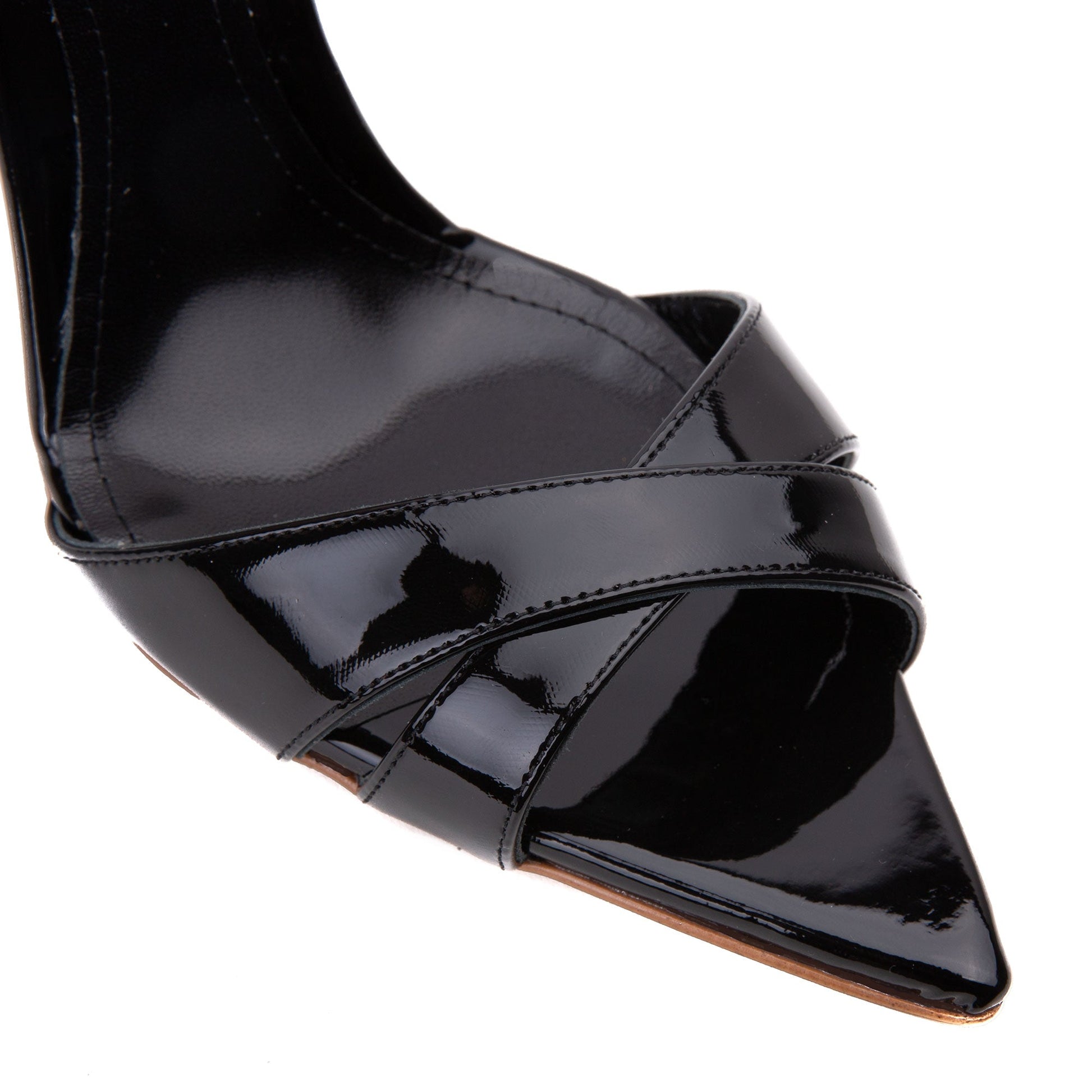 Thea, our take on the Party-Girl look , on a 11 cm stiletto heel, all made from luxurious patent leather and an invisible back silicone strap.